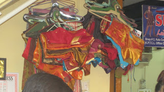 We then move on to the alteration tailor - down another little backstreet, in the back of an arcade and set up in a tiny little cubicle, with his assistant, both behind their sewing machines. For me, its relatively easy, I have taken in the tunic that fits so he has a template. Shubha, meanwhile who has been working out big time and is now very toned and trim needed a couple of pairs of jeans/pants taken in. Given how hard it is to get a pair of jeans to fit I find it a bit incongruous that hardly any measuring seems to be required. We are told to return in 30 mins - very dangerous, plenty of time to do some damage to the wallet! We return and alterations are done. We then have to go for fitting - as the tailor doesn't have a trial (fitting) room we are taken out of the little arcade and into a clothes shop where they have the tiniest changing room - not much room to wriggle out and in ones clothing- in the back.